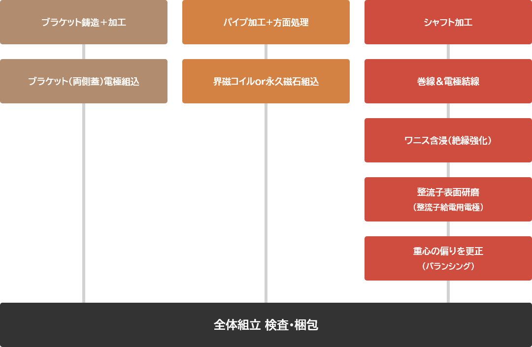 モーターの製造工程をご紹介します。以下のイラストの手順で製造が進んでいきます。